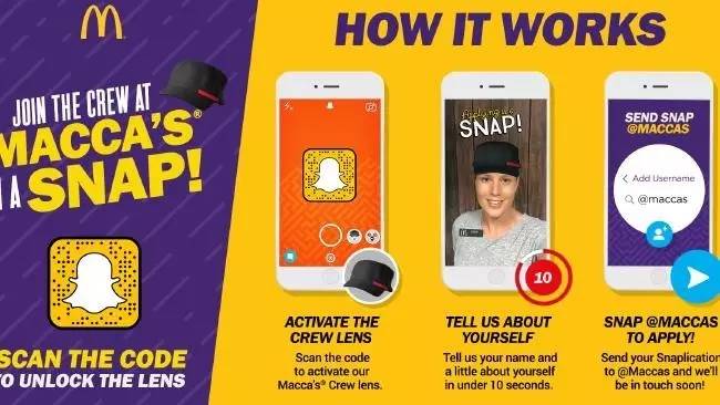据澳大利亚新闻网站au的报道,澳大利亚麦当劳连锁店正在测试使用Snapchat聘用年轻人的新方式。申请人可以尝试穿上虚拟的麦当劳制服,并在10秒钟的视频中展现他们的技能。一旦公司审查了Snapchat,就可下载申请表。